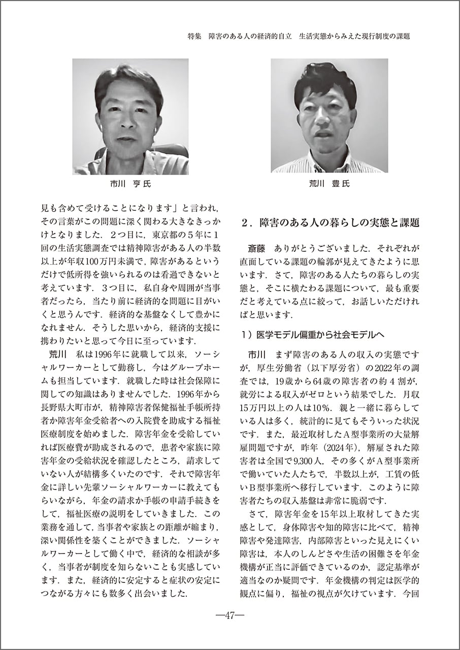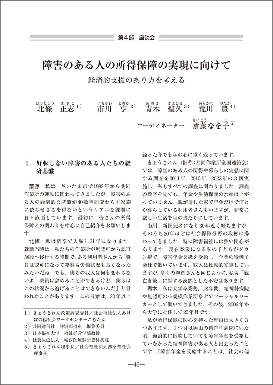 第4部 座談会 障害のある人の所得保障の実現に向けて 経済的支援のあり方を考える 北條正志/市川亨/青木聖久/荒川豊/コーディネーター 斎藤なを子/インタビュー 山口多希代